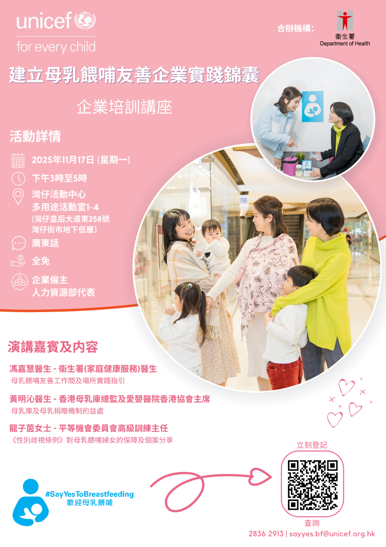 聯合國兒童基金香港委員會(UNICEF HK)倡議「Say Yes To Breastfeeding」運動的支持機構,呼籲大家支持母乳餵哺並攜手共建母乳餵哺友善環境。